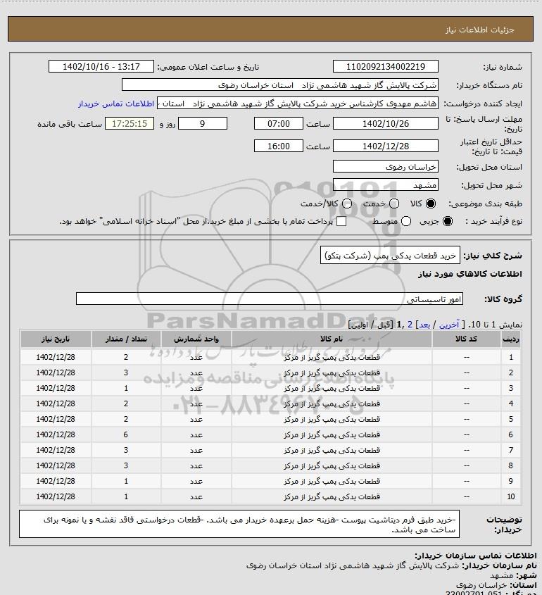 شرح کلی نیاز: خرید قطعات یدکی پمپ (شرکت پتکو)