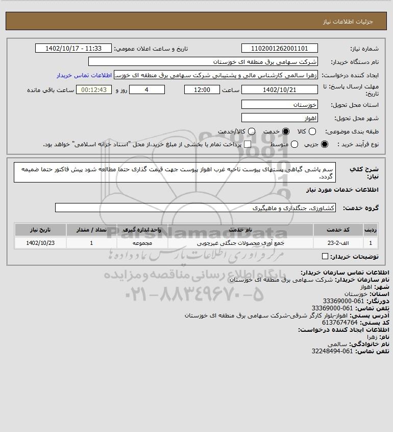 استعلام سم پاشی گیاهی پستهای پیوست ناحیه غرب اهواز پیوست جهت قیمت گذاری حتما مطالعه شود پیش فاکتور حتما ضمیمه گردد., استعلام سم پاشی گیاهی پستهای پیوست ناحیه غرب اهواز پیوست جهت قیمت گذاری حتما مطالعه شود پیش فاکتور حتما ضمیمه گردد.
