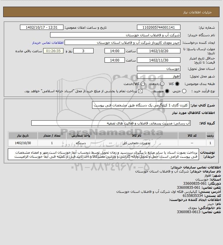 شرح کلی نیاز: کلرزن گازی 1 کیلوگرمی یک دستگاه طبق مشخصات فنی پیوست