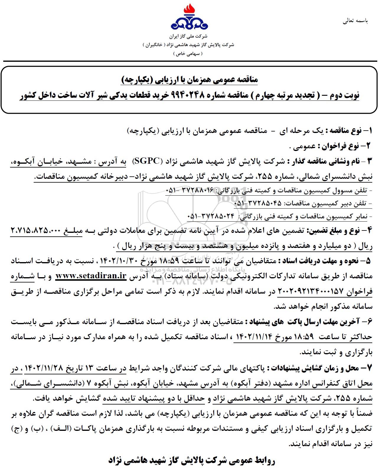 3- نام و نشانی مناقصه گذار: شرکت پالایش گاز شهید هاشمی نژاد SGPC به آدرس مشهد خیابان آبکوه نبش دانشسرای شمالی شماره 255 شرکت پالایش گاز شهید هاشمی نژاد دبیرخانه کمیسیون مناقصات