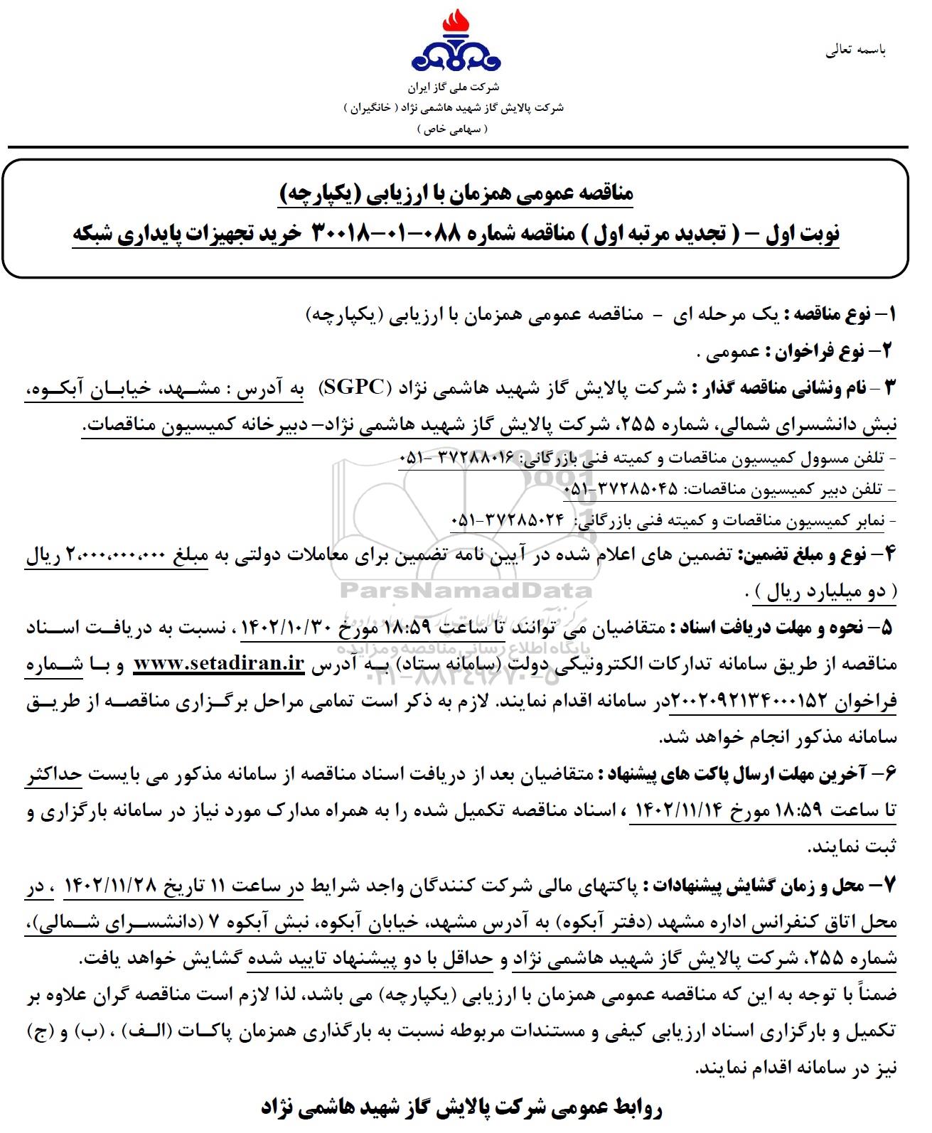 3- نام و نشانی مناقصه گذار: شرکت پالایش گاز شهید هاشمی نژاد (SGPC) به آدرس: مشهد - خیابان آبکوه - نبش دانشسرای شمالی - شماره 255 شرکت پالایش گاز شهید هاشمی نژاد دبیرخانه کمیسیون مناقصات