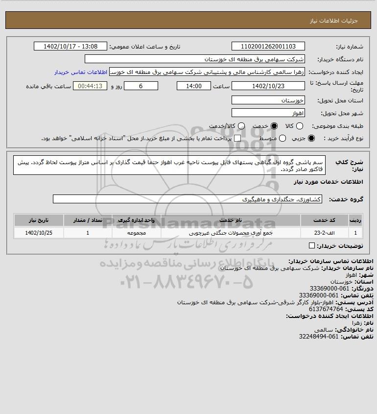 شرح کلی نیاز: سم پاشی گروه اول گیاهی پستهای فایل پیوست ناحیه غرب اهواز
