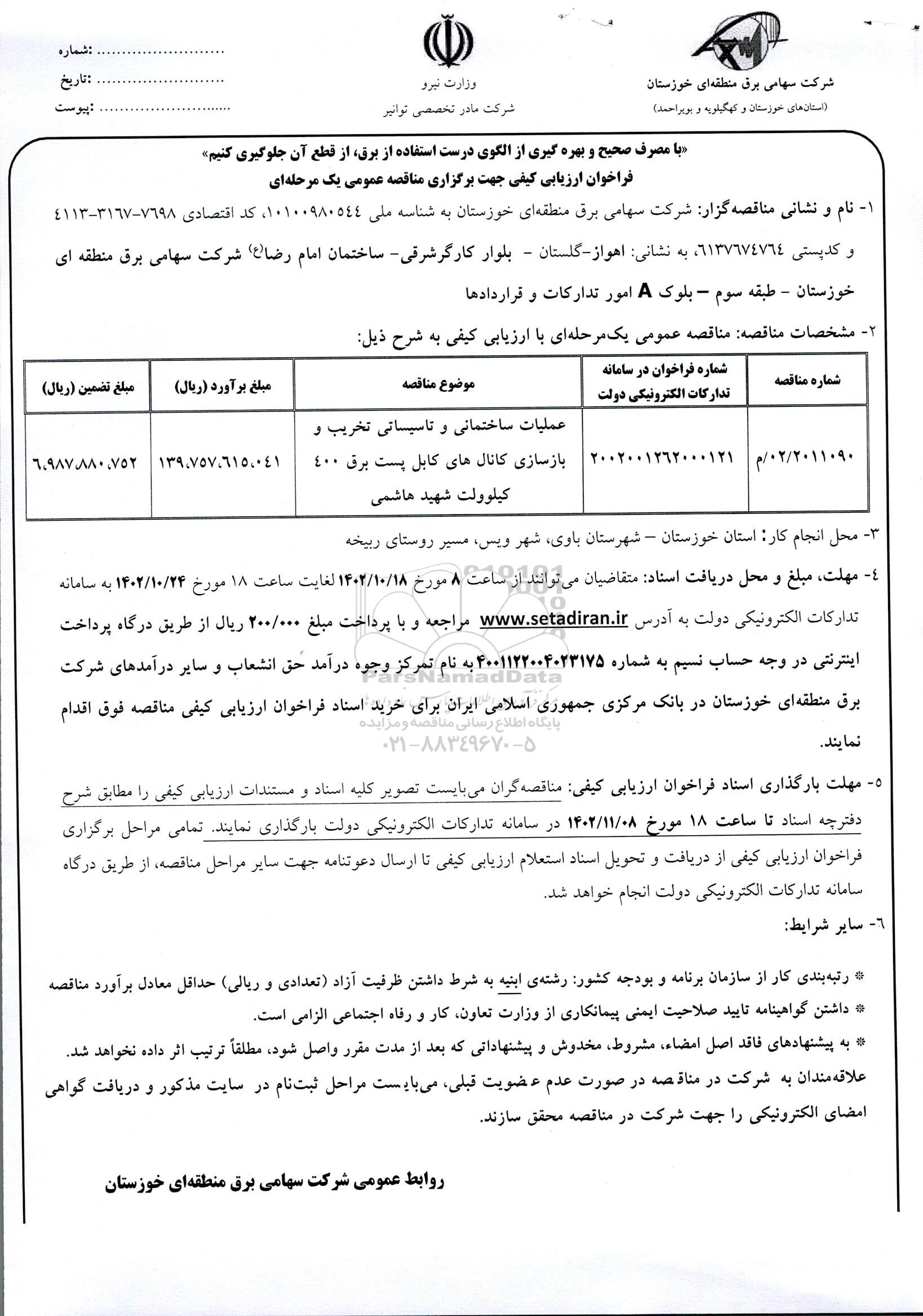 | 2011090/ 02/ م | 2002001262000121 | عملیات ساختمانی و تاسیساتی تخریب و بازسازی کانال های کابل پست برق 400 کیلوولت شهید هاشمی | 139.757.615.041 | 6.987.880.752 |