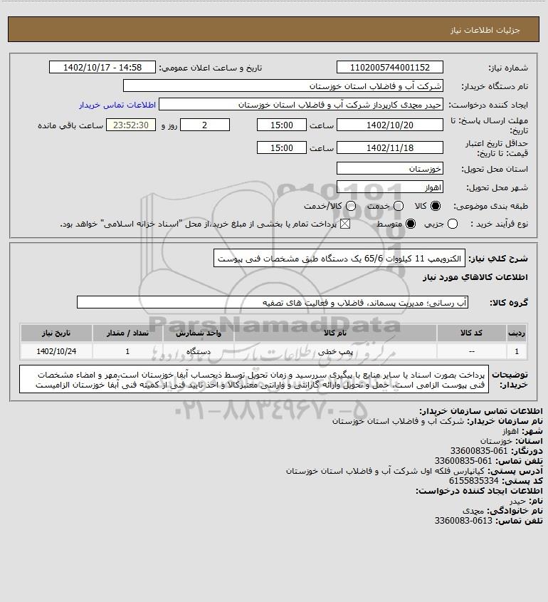 شرح کلی نیاز: الکتروپمپ 11 کیلووات 65/6 یک دستگاه طبق مشخصات فنی پیوست