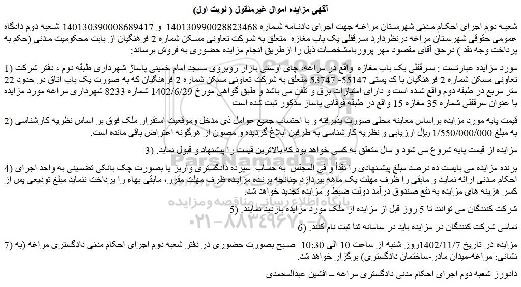 شعبه دوم اجرای احکام مدنی شهرستان مراغه جهت اجرای دادنامه شماره 140130990028823468 و 140130390008689417 شعبه دوم دادگاه عمومی حقوقی شهرستان مراغه درنظردارد سرقفلی یک باب مغازه متعلق به شرکت تعاونی مسکن شماره 2 فرهنگیان از بابت محکومیت مدنی (حکم به پرداخت وجه نقد ) درحق آقای مقصود مهر پروربامشخصات ذیل را ازطریق انجام مزایده حضوری به فروش برساند:
