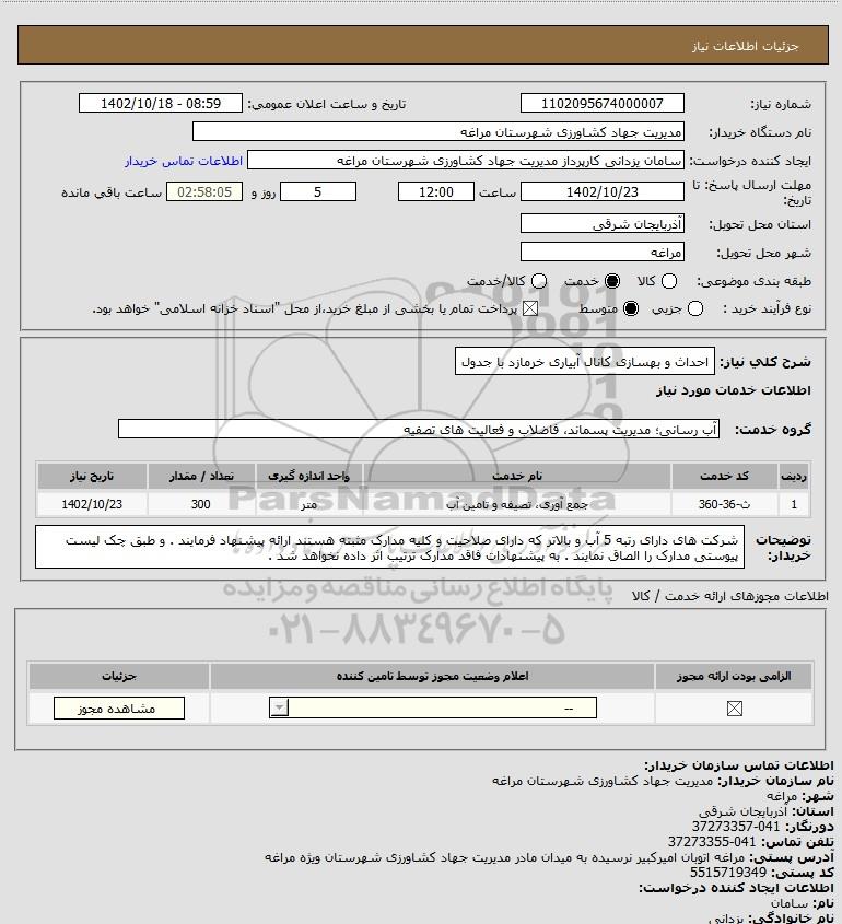 شرح کلی نیاز: احداث و بهسازی کانال آبیاری خرمازد با جدول