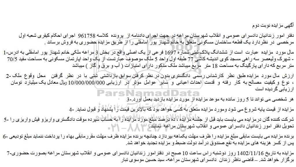 1-مال مورد مزایده عبارت است از ششدانگ پلاک ثبتی شماره 1697 فرعی از یک اصلی واقع در بخش 3 مراغه ملکی خانم شهناز پور امامقلی به ادرس - شهرک ولیعصر سه راهی مسجد کوی اندیشه کاشی 77 طبقه اول واحد 5 ملک موصوف عبارتست از یک واحد اپارتمان مسکونی به مساحت مفید 70/5 متر مربع که دارای پارگینگ به مساحت 18 متر مربع میباشد ملک مذکور دارای امتیازات ( آب و برق و گاز ) میباشد