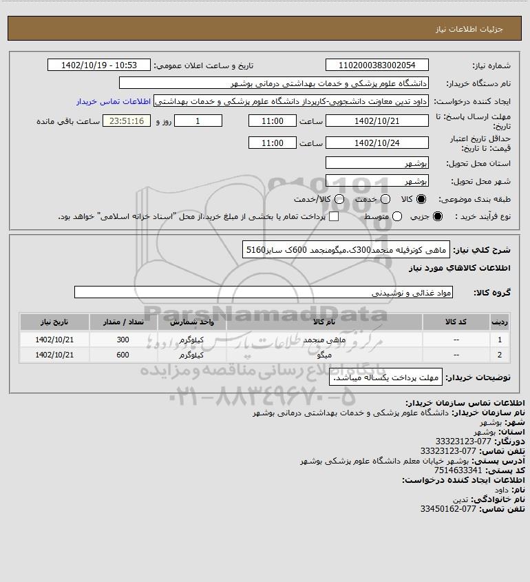 شرح کلی نیاز: ماهی کوترفیله منجمد300ک.میگومنجمد 600ک سایز5160