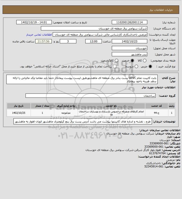 شرح کلی نیاز: بابت کابینت تمام UPVC پست بنادر برق منطقه ای ماهشهرطبق لیست پیوست پیمانکار حتما باید مفاصا وکد مالیاتی را ارائه بدهد هزینه باخود پیمانکار