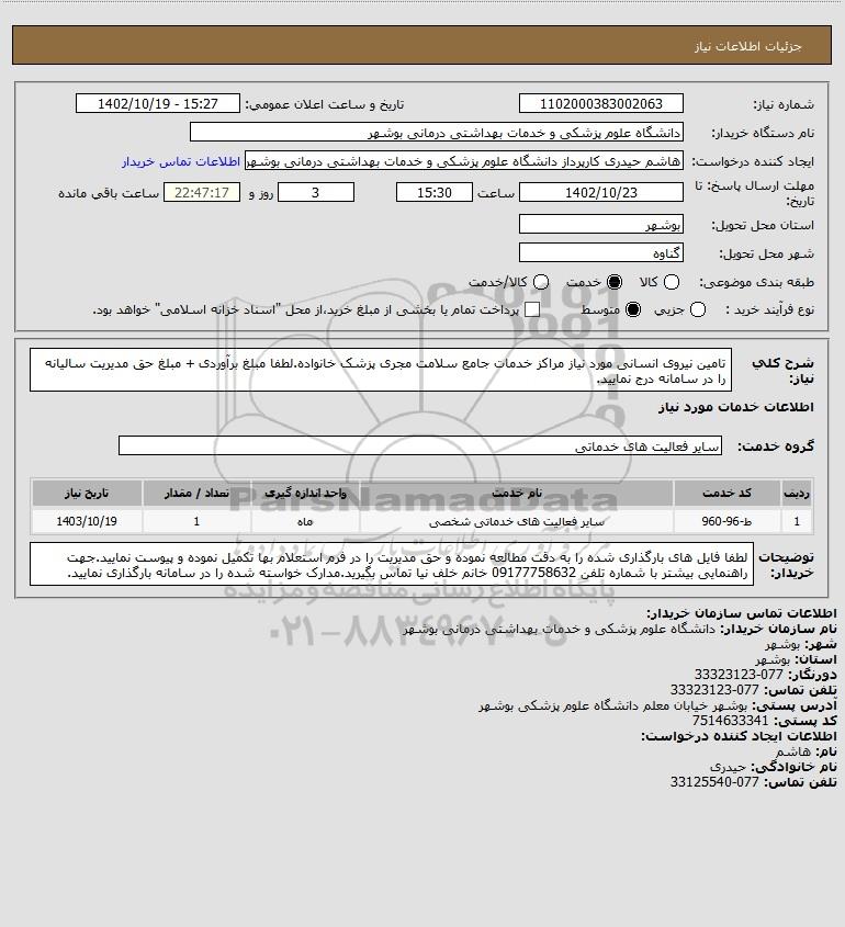 شرح کلی نیاز: تامین نیروی انسانی مورد نیاز مراکز خدمات جامع سلامت مجری پزشک خانواده.لطفا مبلغ برآوردی + مبلغ حق مدیریت سالیانه را در سامانه درج نمایید.