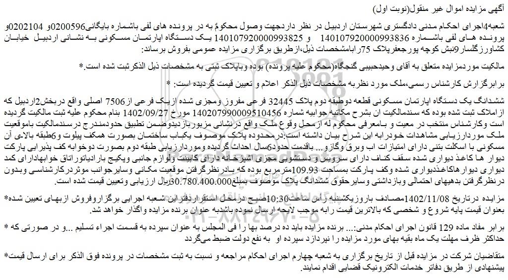 شعبه4اجرای احکام مدنی دادگستری شهرستان اردبیل در نظر داردجهت وصول محکومٌ به در پرونده های لفی باشماره بایگانی0200596و 0202104و پرونده های لفی باشماره 140107920000993836 و 140107920000993825 یک دستگاه اپارتمان مسکونی به نشانی اردبیل خیابان کشاورزگلسار9نبش کوچه پورجعفرپلاک 75رابامشخصات ذیل،ازطریق برگزاری مزایده عمومی بفروش برساند: