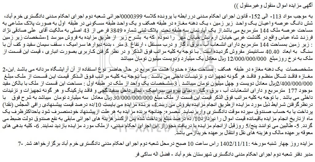 به موجب مواد 113- الی 152- قانون اجرای احکام مدنی دررابطه با پرونده کلاسه 0000399اجرائی شعبه دوم اجرای احکام مدنی دادگستری خرم آباد،  شش دانگ عرصه واعیان یک واحد  زیر زمین ، یک دهنه مغازه در طبقه همکف و یک واحد طبقه مسکونی در طبقه  اول به صورت پلاک مشاعی به مساحت عرصه ملک 144 مترمربع می باشد.از یک آپارتمان سه طبقه تحت  پلاک ثبتی شماره 3849 فرعی از 43 اصلی به مالکیت آقای  علی صادقی نژاد فرزند شاه عباس واقع در گلدشت غربی خیابان ارم نبش خیابان مهر  را نموده  که به  بشرح زیر  از طریق مزایده به فروش میرسد 1-مشخصات زیر زمین : زیر زمین بمساحت 144 مترمربع دارای انشعاب آب ، برق ، گاز و درب مستقل ، ارتفاع  3 متر ، بدنه دیوارها سرامیک ، سقف سیمان سفید و کف آن با سنگ  به ابعاد  40.40 سانتیمتر مفروش گردیده است . با توجه به کلیه مراتب فوق الذکر و در نظر گرفتن کاربری بصورت انباری ، قیمت این قسمت از ملک به نرخ روزمبلغ  12/000/000/000 ریال معادل یک میلیارد ودویست میلیون تومان میباشد