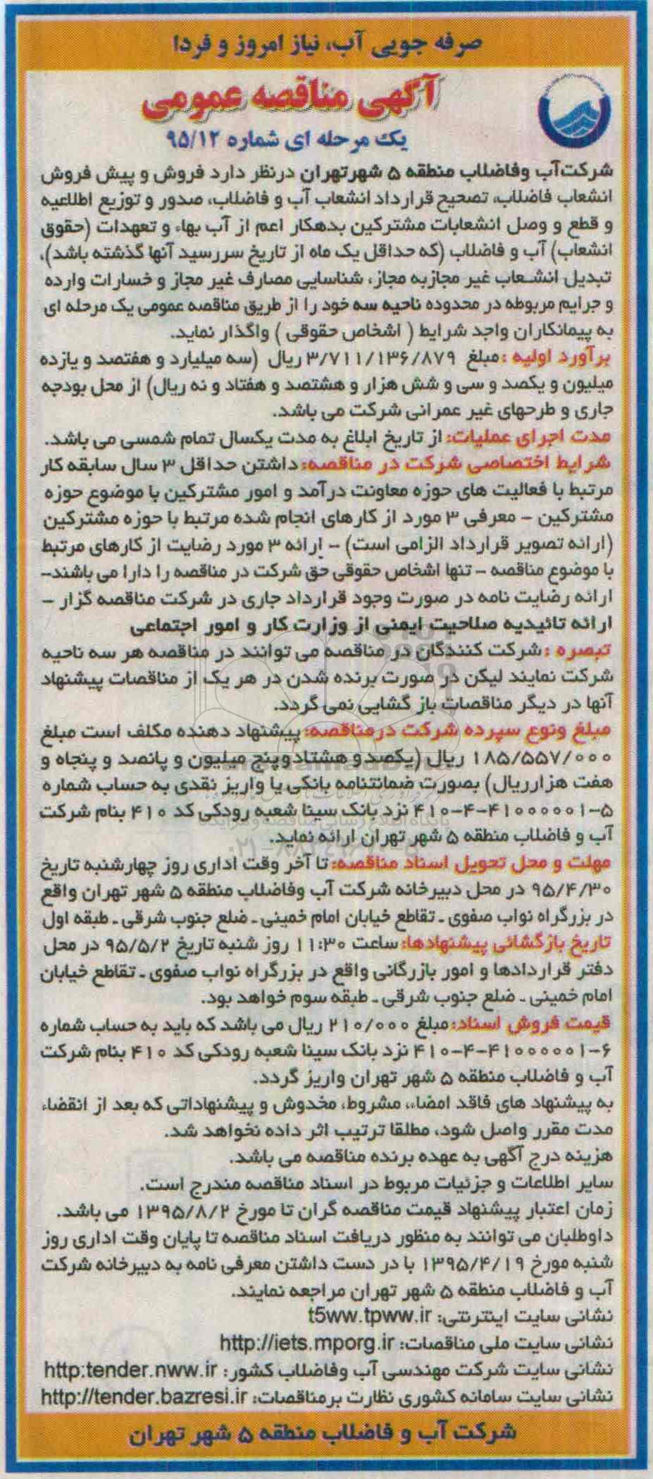 داوطلبان می توانند به منظور دریافت اسناد مناقصه تا پایان وقت اداری روز شنبه مورخ 95.4.19 با در دست داشتن معرفی نامه به دبیرخانه شرکت آب و فاضلاب منطقه 5 شهر تهران مراجعه نمایند.