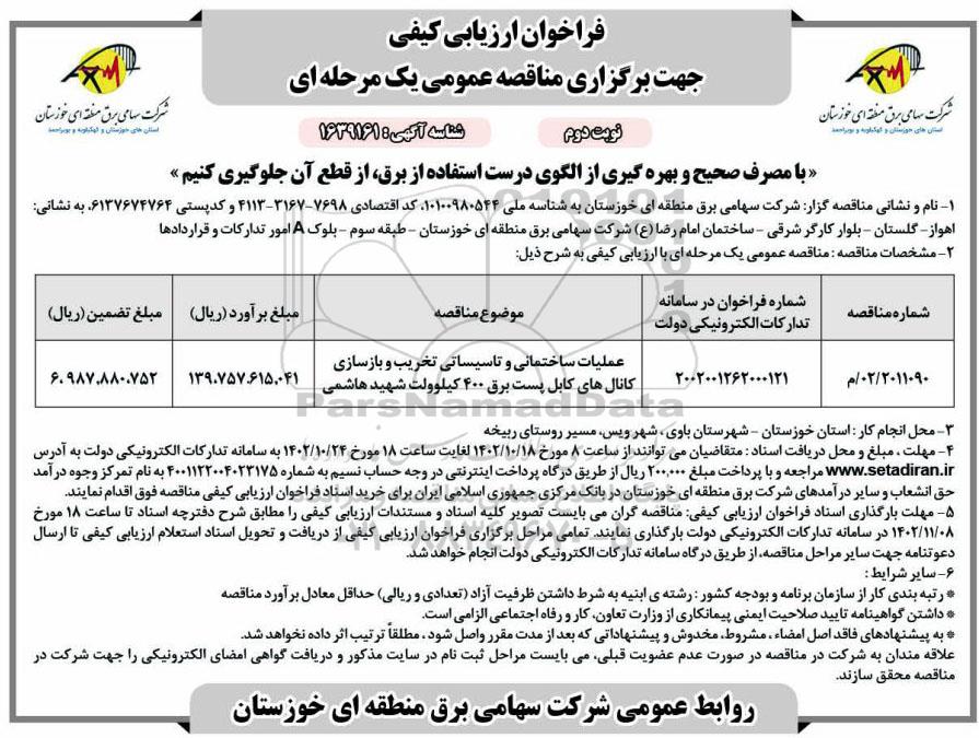 | 2011090/ 02/ م | 2002001262000121 | عملیات ساختمانی و تاسیساتی تخریب و بازسازی کانال های کابل پست برق 400 کیلوولت شهید هاشمی | 139.757.615.041 | 6.987.880.752 |
