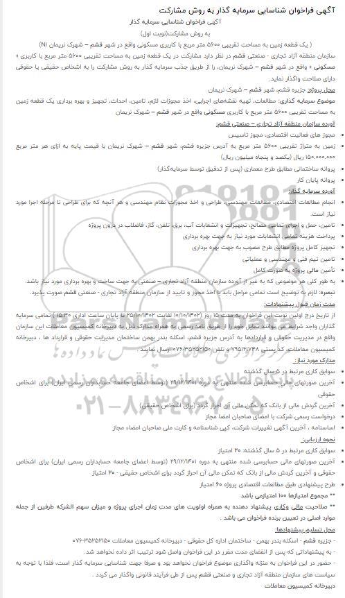 سازمان منطقه آزاد تجاری - صنعتی قشم در نظر دارد مشارکت در یک قطعه زمین به مساحت تقریبی 5600 متر مربع با کاربری « مسکونی » واقع در شهر قشم – شهرک نریمان، را از طریق جذب سرمایه گذار به روش مشارکت را به اشخاص حقیقی یا حقوقی دارای صلاحت واگذار نماید.