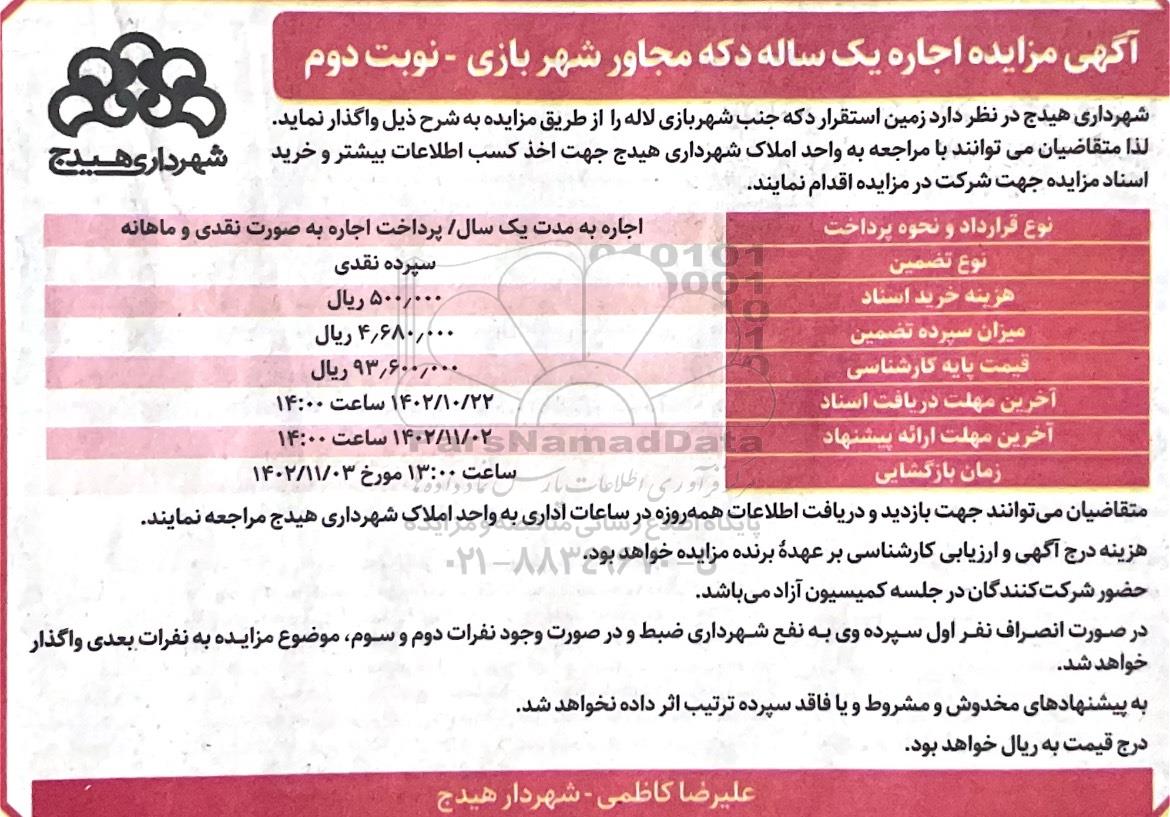 آگهی مزایده اجاره یکساله دکه مجاور شهربازی- نوبت دوم - مزایده روز چهارشنبه بیستم دی 1402 , آگهی مزایده اجاره یکساله دکه مجاور شهربازی- نوبت دوم