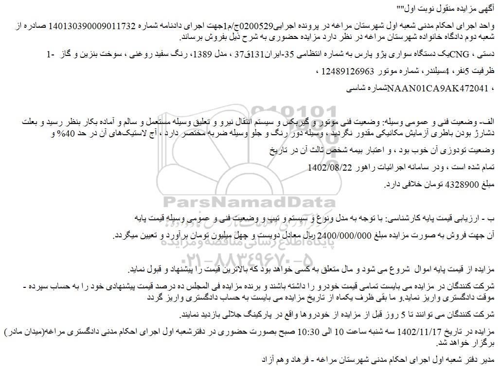 مزایده در تاریخ 1402/11/17 سه شنبه ساعت 10 الی 10:30 صبح بصورت حضوری در دفترشعبه اول اجرای احکام مدنی دادگستری مراغه(میدان مادر) برگزار خواهد شد.