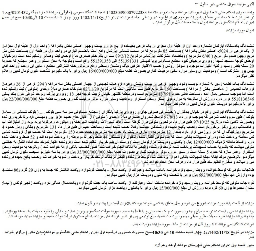متن آگهی: "آگهی مزایده اموال مشاعی غیر منقول " واحد اجرای احکام مدنی شعبه اول شهرستان مراغه جهت اجرای دادنامه 140230390007922383 شعبه 5 دادگاه عمومی (حقوقی) مراغه شماره بایگانی0201432/ج.م 1 در نظر دارد ملک مشاعی متعلق به وراث مرحوم محمد دباغ اوحدی را طی جلسه مزایده ای در تاریخ1402/11/18 روز چهار شنبه ساعت 10 الی10:30صبح در محل اجرای احکام دادگستری مراغه اموال با مشخصات ذیل برگزار نماید . اموال مورد مزایده: 1-ششدانگ یکدستگاه آپارتمان بشماره واحد اول از طبقه اول مجزی از یک فرعی باقیمانده از پنج هزارو بیست وچهار اصلی بخش یکمراغه ( واحد اول از طبقه اول مجزا از یک فرعی از 5024- اصلی بخش یکمراغه ) بمساحت 85 مترمربع که در سمت شمالی آپارتمان واقع است بانضمام انباری دو واحد اول در طبقه اول بمساحت شش متر مربع وچهل صدم متر مربع ( 6/40 مترمربع ) وبانضمام مشترکات آپارتمانی درتاریخ 89/2/12 سند آن بنام خانم صغری دباغ اوحدی ثبت وصادر وتسلیم شده است ودرخیابان اوحدی کوچه مسجد شهدا روبروی برجهای کبود مجتمع مسکونی پویا کدپستی 551391331 الی 551391358 واقع است وباتوجه به محل استقرار وعمر مجتمع که حدودا 20 ساله بنظر رسید و کلیه امتیازات موجود و سوفاژ روشن ( حسب الاظهار طرفین دیگ ومشعل وسطی واقع درموتورخانه اشتراکی مجتمع ، مابین این واحد وواحد آقای بهمن پور مشترک است ) وموقعیت آن وسایر موارد دخیل درقیمت گذاری بصورت قطعه مبلغ 16/000/000/000 ریال برابر با یک ملیاردو ششصد ملیون تومان تعیین واعلام نظر میگردد. 2-ششدانگ یک قطعه زمین به شماره دویست ونود وچهار فرعی از بیست وشش وغیره فروعات تجمیعی از چهار اصلی بخش سه مراغه ( 294 فرعی از 26 وغیره فروعات تجمیعی از 4-اصلی بخش 3 مراغه ) بمساحت 190 مترمربع طبق سند مالکیتی است که درتاریخ 82/11/20 بنام خانم صغری دباغ اوحدی (متوفی ) ثبت وتسلیم شده است اما بموجب مساحی بعمل آمده ، مساحت فعلی حدود 187/91 مترمربع است ودرمنطقه گلشهر خیابان تربیت کوچه فجر 18 روبروی پارک ودرحد شرقی منزل باکد پستی 5518136346 قرار دارد وارزش آن باتوجه به موارد فوق الذکر ومحل استقرار وموقعیت وسایر موارد موثر درقیمت گذاری بصورت قطعه مبلغ 22/000/000/000 ریال برابر با دوملیاردو دویست ملیون تومان تعیین واعلام نظر میگردد. 3-ششدانگ یکدستگاه آپارتمان واقع در خیابان یادگاران ( حدشرقی صوفی چای و روبروی پارک یادگاران ) مجتمع مسکونی سو سه سی بلوک .....( بلوک شمالی از سه بلوک ) طبق سوم واحد شرقی که بموجب قرار داد 97/8/13 توسط شادروان صغری دباغ اوحدی ( متوفی ) از آقایان حاج حمید عزیز پور ومهندس محمد برنا خریداری شده وبصورت تکمیل شده درتاریخ 97/10/25 طبق قرار داد درتحویل متوفی قرار گرفته است وفاقد شیرآلات وکابینت آشپزخانه ورادیاتورها وهرگونه پرده بوده واز امتیازات آب و فاضلاب وبرق وگاز برخورداراست ونصب پکیچ بعهده فروشندگان میباشد وفعلا نصب نشده است ومساحت مفید آن طبق قرار داد 131 مترمربع وبالکن روباز حدود 4 مترمربع وپارکینگ آن که در زیرزمین قرار دارد بمقدار 12 مترمربع و انباری درپشت بام حدود سه مترمربع وجمعا حدود 150 مترمربع است که حسب قبول فروشنده تمامی ثمن معامله پرداخت شده ودارای تسهیلات بانکی است که بنام متوفی انتقال نشده وتاکنون فروشندگان 44 قسط وجرائم مربوطه را پرداخت نموده اند و 52 قسط پرداخت نشده دارد واقساط ماهانه نزدیک 12/000/000 ریال ( یکملیون ودویست هزارتومان است ) و سند آن بنام خریدار تنظیم نشده است وفروشنده اظهارنمودند سند آماده انتقال به جانشین متوفی میباشد که باتسویه حساب تسهیلات پرداخت شده توسط فروشنده والباقی به بانک انجام خواهد شد( صورتحساب بانکی ارائه خواهد شد ) وباتوجه به موقعیت ومحل استقرار وعمر سازه که حدود 5 ساله است و سایر موارد موثر درقیمت گذاری بصورت قطعه مبلغ 33/000/000/000 ریال برابر با سه ملیاردو سیصد ملیون تومان تعیین میگرددو باتوضیح موکد اینکه مبالغ تسهیلات بانکی اعم از پرداخت شده توسط فروشنده والباقی دربانک توسط خریدار پرداخت و تسویه خواهد شد ونصب پکیج بعهده فروشنده م