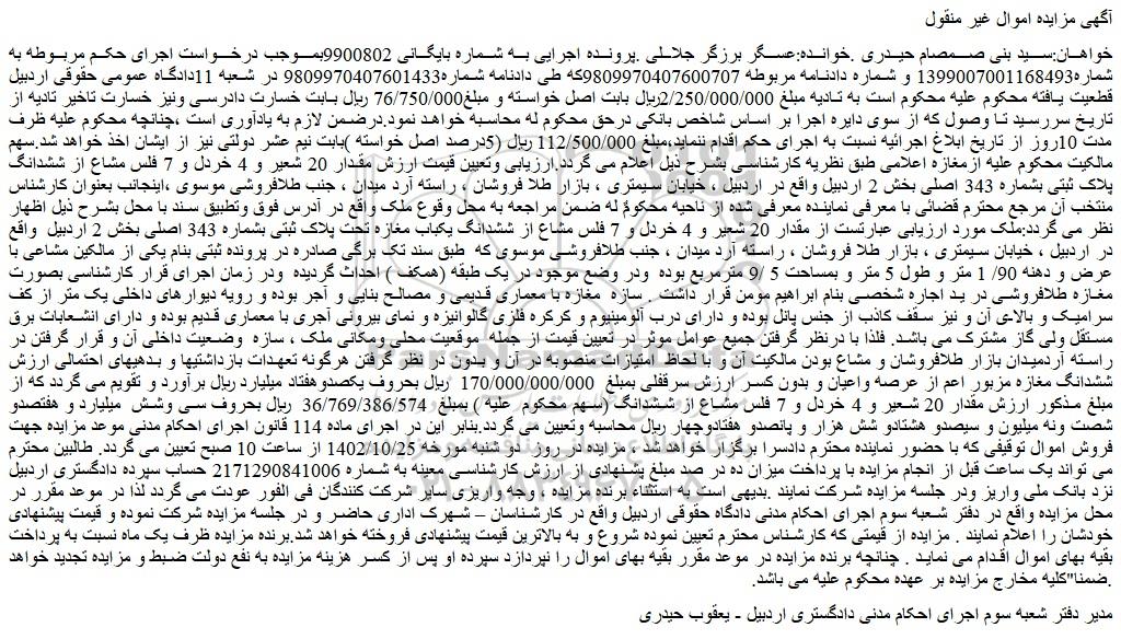 خواهان:سید بنی صمصام حیدری .خوانده:عسگر برزگر جلالی .پرونده اجرایی به شماره بایگانی 9900802بموجب درخواست اجرای حکم مربوطه به شماره1399007001168493 و شماره دادنامه مربوطه 9809970407600707که طی دادنامه شماره9809970407601433 در شعبه 11دادگاه عمومی حقوقی اردبیل قطعیت یافته محکوم علیه محکوم است به تادیه مبلغ 2/250/000/000ریال بابت اصل خواسته و مبلغ76/750/000 ریال بابت خسارت دادرسی ونیز خسارت تاخیر تادیه از تاریخ سررسید تا وصول که از سوی دایره اجرا بر اساس شاخص بانکی درحق محکوم له محاسبه خواهد نمود.درضمن لازم به یادآوری است ،چنانچه محکوم علیه ظرف مدت 10روز از تاریخ ابلاغ اجرائیه نسبت به اجرای حکم اقدام ننماید،مبلغ 112/500/000 ریال (5درصد اصل خواسته )بابت نیم عشر دولتی نیز از ایشان اخذ خواهد شد.سهم مالکیت محکوم علیه ازمغازه اعلامی طبق نظریه کارشناسی بشرح ذیل اعلام می گردد.ارزیابی وتعیین قیمت ارزش مقدار 20 شعیر و 4 خردل و 7 فلس مشاع از ششدانگ پلاک ثبتی بشماره 343 اصلی بخش 2 اردبیل واقع در اردبیل ، خیابان سیمتری ، بازار طلا فروشان ، راسته آرد میدان ، جنب طلافروشی موسوی ،اینجانب بعنوان کارشناس منتخب آن مرجع محترم قضائی با معرفی نماینده معرفی شده از ناحیه محکومٌ له ضمن مراجعه به محل وقوع ملک واقع در آدرس فوق وتطبیق سند با محل بشرح ذیل اظهار نظر می گردد:ملک مورد ارزیابی عبارتست از مقدار 20 شعیر و 4 خردل و 7 فلس مشاع از ششدانگ یکباب مغازه تحت پلاک ثبتی بشماره 343 اصلی بخش 2 اردبیل  واقع در اردبیل ، خیابان سیمتری ، بازار طلا فروشان ، راسته آرد میدان ، جنب طلافروشی موسوی که  طبق سند تک برگی صادره در پرونده ثبتی بنام یکی از مالکین مشاعی با عرض و دهنه 90/ 1 متر و طول 5 متر و بمساحت 5 /9 مترمربع بوده  ودر وضع موجود در یک طبقه (همکف ) احداث گردیده  ودر زمان اجرای قرار کارشناسی بصورت مغازه طلافروشی در ید اجاره شخصی بنام ابراهیم مومن قرار داشت . سازه  مغازه با معماری قدیمی و مصالح بنایی و آجر بوده و رویه دیوارهای داخلی یک متر از کف سرامیک و بالای آن و نیز سقف کاذب از جنس پانل بوده و دارای درب آلومینیوم و کرکره فلزی گالوانیزه و نمای بیرونی آجری با معماری قدیم بوده و دارای انشعابات برق مستقل ولی گاز مشترک می باشد. فلذا با درنظر گرفتن جمیع عوامل موثر در تعیین قیمت از جمله  موقعیت محلی ومکانی ملک ، سازه  وضعیت داخلی آن و قرار گرفتن در راسته آردمیدان بازار طلافروشان و مشاع بودن مالکیت آن و با لحاظ  امتیازات منصوبه در آن و بدون در نظر گرفتن هرگونه تعهدات بازداشتیها و بدهیهای احتمالی ارزش ششدانگ مغازه مزبور اعم از عرصه واعیان و بدون کسر ارزش سرقفلی بمبلغ  170/000/000/000  ریال بحروف یکصدوهفتاد میلیارد ریال برآورد و تقویم می گردد که از مبلغ مذکور ارزش مقدار 20 شعیر و 4 خردل و 7 فلس مشاع از ششدانگ (سهم محکوم  علیه ) بمبلغ  36/769/386/574  ریال بحروف سی وشش  میلیارد و هفتصدو شصت ونه میلیون و سیصدو هشتادو شش هزار و پانصدو هفتادوچهار ریال محاسبه وتعیین می گردد.بنابر این در اجرای ماده 114 قانون اجرای احکام مدنی موعد مزایده جهت فروش اموال توقیفی که با حضور نماینده محترم دادسرا برگزار خواهد شد ، مزایده در روز  دو شنبه مورخه 1402/10/25 از ساعت 10 صبح تعیین می گردد. طالبین محترم می تواند یک ساعت قبل از انجام مزایده با پرداخت میزان ده در صد مبلغ پشنهادی از ارزش کارشناسی معینه به شماره 2171290841006 حساب سپرده دادگستری اردبیل نزد بانک ملی واریز ودر جلسه مزایده شرکت نمایند .بدیهی است به استثناء برنده مزایده ، وجه واریزی سایر شرکت کنندگان فی الفور عودت می گردد لذا در موعد مقرر در محل مزایده واقع در دفتر شعبه سوم اجرای احکام مدنی دادگاه حقوقی اردبیل واقع در کارشناسان – شهرک اداری حاضر و در جلسه مزایده شرکت نموده و قیمت پیشنهادی خودشان را اعلام نمایند . مزایده از قیمتی که کارشناس محترم تعیین نموده شروع و به بالاترین قیمت پیشنهادی فروخته خواهد شد.برنده مزایده ظرف یک ماه نسبت به پرداخت بقیه بهای اموال ا