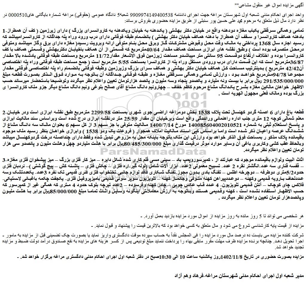 - مزایده بصورت حضوری در تاریخ 1402/11/8روز یکشنبه ساعت 10 الی 10:30صبح در دفتر شعبه اول اجرای احکام مدنی دادگستری مراغه برگزار خواهد شد.