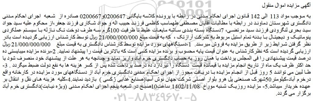 به موجب مواد 113 الی 142 قانون اجرای احکام مدنی در رابطه با پرونده کلاسه بایگانی 0200647و0200667 صادره از  شعبه  اجرای احکام مدنی دادگستری شهرستان دماوند در رابطه با مطالبات آقایان مصطفی طهماسب کاظمی فرزند حبیب اله و جواد شکاری فرزند جعفر،از محکوم علیه سید جواد سید بحری لنگرودی فرزند سید مرتضی، 7دستگاه بسته بندی ساشه مایعات غلیظ تا ظرفیت 100گرم سه طرف دوخت تک نازله با سیستم عملکردی پنوماتیک و دیجیتال با بدنه تمام استیل مربوط به شرکت آرازتک ،  که به قیمت مبلغ 21/000/000/000 ریال توسط کارشناس ارزیابی گردیده است بادر نظر گرفتن شرایط زیر از طریق مزایده به فروش میرسند.  1-دستگاههای مورد مزایده توسط کارشناس دادگستری به قیمت مبلغ    21/000/000/000 ریال ارزیابی گردیده است که نظرکارشناس به عنوان قیمت پایه محسوب و برنده مزایده کسی است که بالاترین قیمت را پیشنهاد نمایید. 2-برنده مزایده میبایستی ده درصد قیمت پیشنهادی را فی المجلس پرداخت یا همان روز به حساب دادگستری خرم آباد واریز نماید و چنانچه به هر علت از پیشنهاد خود منصرف شود یا حد اکثر ظرف یک ماه از تاریخ انجام مزایده با قیمانده قیمت  دستگاه را نپردازد ده درصد پرداخت شده پس از کسر هزینه ها به نفع دولت ضبط میگردد . 3- طا لبین می توانند 5 روز قبل از انجام مزایده با دریافت مجوز از اجرای احکام مدنی دادگستری خرم آباد از دستگاههای مورد مزایده در کارخانه واقع درخرم آباد-کیلومتر50شهرک صنعتی پل هرو بلوار اصلی شرکت جهان نوش آسیا(صنایع غذایی ژکسی )  بازدید نمایند.4-کلیه  هزینه های نقل و انتقال بر عهده خریدار میباشد.5- مزایده روزیک شنبه مورخ  1402/11/08 ساعت10صبح در شعبه پنجم اجرای احکام مدنی (ویژه نیابت)دادگستری خرم آباد برگزار می گردد.