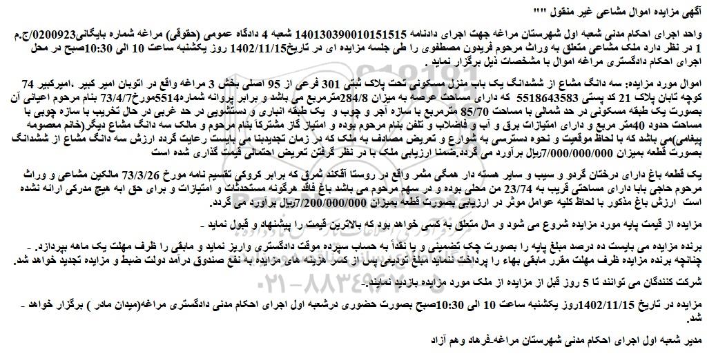"آگهی مزایده اموال مشاعی غیر منقول "