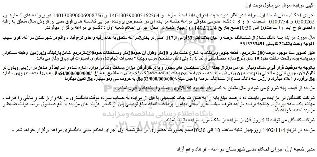 ،اجرای احکام مدنی شعبه اول مراغه در نظر دارد جهت اجرای دادنامه شماره و 140130390005162364 و 140130390006908756 در پرونده های شماره و 0200262 و 0100754 شعبات 5 و 3 دادگاه عمومی حقوقی مراغه جلسه مزایده ای در خصوص پرونده اجرایی کلاسه های فوق مبنی بر فروش مال متعلق به رقیه واحدی کرج اباد را ساعت10 الی 10:30صبح بتاریخ 1402/11/4 روزچهار شنبه در محل اجرای احکام شعبه اول دادگستری مراغه برگزار میگردد.
