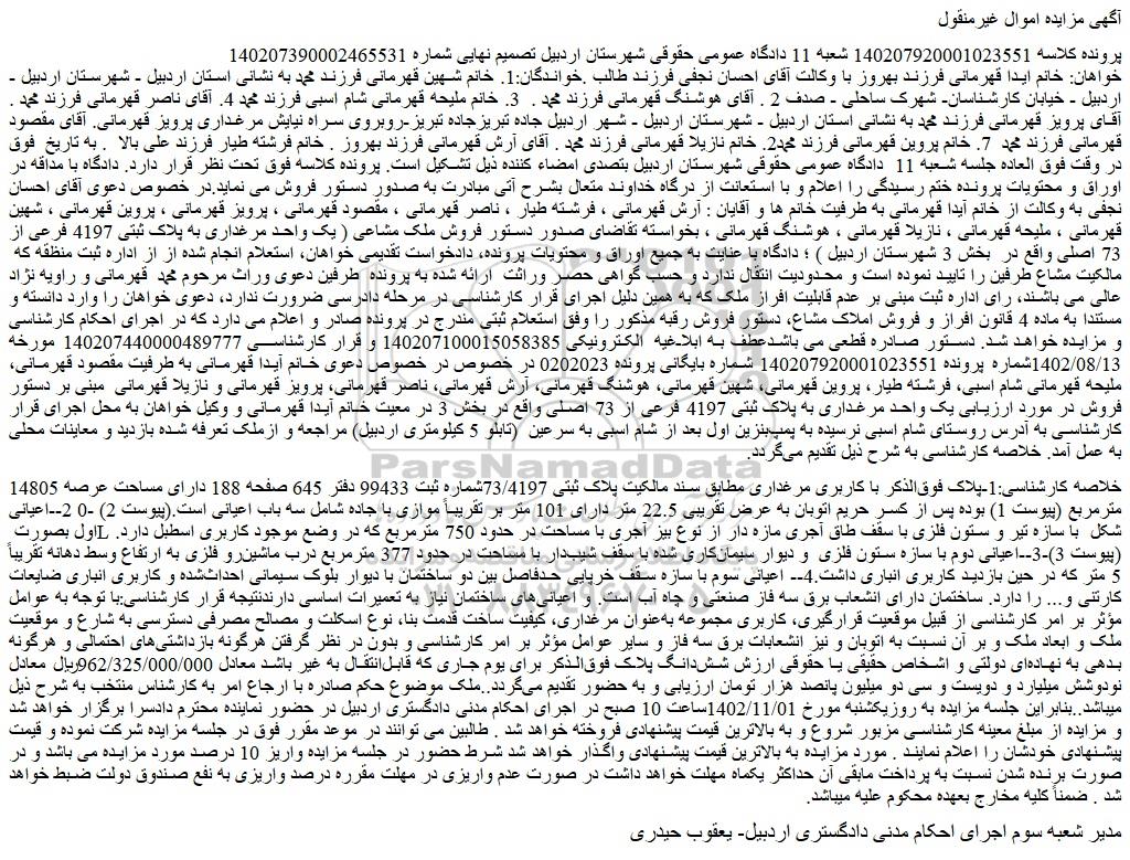 خواهان: خانم ایدا قهرمانی فرزند بهروز با وکالت آقای احسان نجفی فرزند طالب .خواندگان:1. خانم شهین قهرمانی فرزند محمد به نشانی استان اردبیل - شهرستان اردبیل - اردبیل - خیابان کارشناسان- شهرک ساحلی - صدف 2 . آقای هوشنگ قهرمانی فرزند محمد .  3. خانم ملیحه قهرمانی شام اسبی فرزند محمد 4. آقای ناصر قهرمانی فرزند محمد . آقای پرویز قهرمانی فرزند محمد به نشانی استان اردبیل - شهرستان اردبیل - شهر اردبیل جاده تبریزجاده تبریز-روبروی سراه نیایش مرغداری پرویز قهرمانی. آقای مقصود قهرمانی فرزند محمد  7. خانم پروین قهرمانی فرزند محمد2. خانم نازیلا قهرمانی فرزند محمد . آقای آرش قهرمانی فرزند بهروز . خانم فرشته طیار فرزند علی بالا  . به تاریخ  فوق در وقت فوق العاده جلسه شعبه 11  دادگاه عمومی حقوقی شهرستان اردبیل بتصدی امضاء کننده ذیل تشکیل است. پرونده کلاسه فوق تحت نظر قرار دارد. دادگاه با مداقه در اوراق و محتویات پرونده ختم رسیدگی را اعلام و با استعانت از درگاه خداوند متعال بشرح آتی مبادرت به صدور دستور فروش می نماید.در خصوص دعوی آقای احسان نجفی به وکالت از خانم آیدا قهرمانی به طرفیت خانم ها و آقایان : آرش قهرمانی ، فرشته طیار ، ناصر قهرمانی ، مقصود قهرمانی ، پرویز قهرمانی ، پروین قهرمانی ، شهین قهرمانی ، ملیحه قهرمانی ، نازیلا قهرمانی ، هوشنگ قهرمانی ، بخواسته تقاضای صدور دستور فروش ملک مشاعی ( یک واحد مرغداری به پلاک ثبتی 4197 فرعی از 73 اصلی واقع در  بخش 3 شهرستان اردبیل ) ؛ دادگاه با عنایت به جمیع اوراق و محتویات پرونده، دادخواست تقدیمی خواهان، استعلام انجام شده از از اداره ثبت منظقه که  مالکیت مشاع طرفین را تایید نموده است و محدودیت انتقال ندارد و حسب گواهی حصر وراثت  ارائه شده به پرونده  طرفین دعوی وراث مرحوم محمد  قهرمانی و راویه نژاد عالی می باشند، رای اداره ثبت مبنی بر عدم قابلیت افراز ملک که به همین دلیل اجرای قرار کارشناسی در مرحله دادرسی ضرورت ندارد، دعوی خواهان را وارد دانسته و مستندا به ماده 4 قانون افراز و فروش املاک مشاع، دستور فروش رقبه مذکور را وفق استعلام ثبتی مندرج در پرونده صادر و اعلام می دارد که در اجرای احکام کارشناسی و مزایده خواهد شد. دستور صادره قطعی می باشدعطف به ابلاغیه  الکترونیکی 140207100015058385 و قرار کارشناسی 140207440000489777 مورخه 1402/08/13شماره پرونده 140207920001023551 شماره بایگانی پرونده 0202023 در خصوص در خصوص دعوی خانم آیدا قهرمانی به طرفیت مقصود قهرمانی، ملیحه قهرمانی شام اسبی، فرشته طیار، پروین قهرمانی، شهین قهرمانی، هوشنگ قهرمانی، آرش قهرمانی، ناصر قهرمانی، پرویز قهرمانی و نازیلا قهرمانی  مبنی بر دستور فروش در مورد ارزیابی یک واحد مرغداری به پلاک ثبتی 4197 فرعی از 73 اصلی واقع در بخش 3 در معیت خانم آیدا قهرمانی و وکیل خواهان به محل اجرای قرار کارشناسی به آدرس روستای شام اسبی نرسیده به پمپ بنزین اول بعد از شام اسبی به سرعین  (تابلو 5 کیلومتری اردبیل) مراجعه و ازملک تعرفه شده بازدید و معاینات محلی به عمل آمد. خلاصه کارشناسی به شرح ذیل تقدیم می گردد.