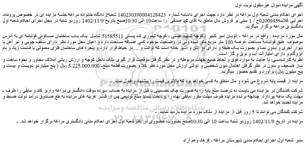- مزایده در تاریخ 1402/11/9 روزدو شنبه ساعت 10 الی 10:30صبح بصورت حضوری در دفترشعبه اول اجرای احکام مدنی دادگستری مراغه برگزار خواهد شد.