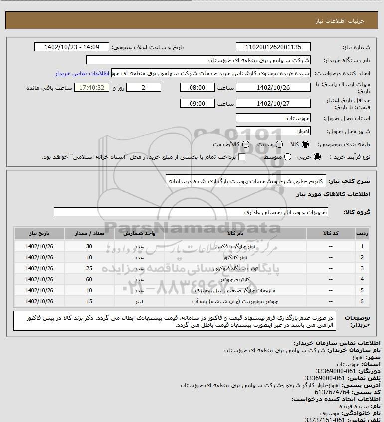 | 4 | -- | کارتریج جوهر | عدد | 60 | 1402/10/26 |