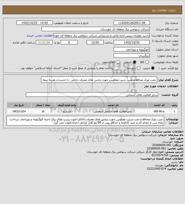 توضیحات خریدار:نصب توری محافظ و نصب شیب معکوس جهت ترانس های مصرف داخلی جهت پست های برق ناحیه کهگیلویه و بویراحمد -پرداخت وجه پس از انجام کار و تایید کارفرما و حداقل پس از 90 روز طی مراحل اداری صورت می گیرد