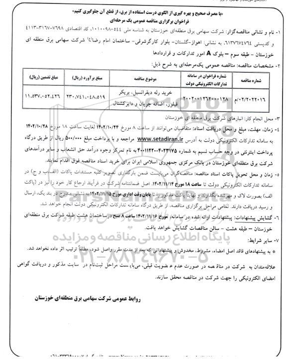 | 02/2022016/ م | 2002001262000128 | خرید رله دیفرانسیل، بریکر فیلور، اضافه جریان و دایرکشنال | 230.741.048.519 | 11.537.052.426 |