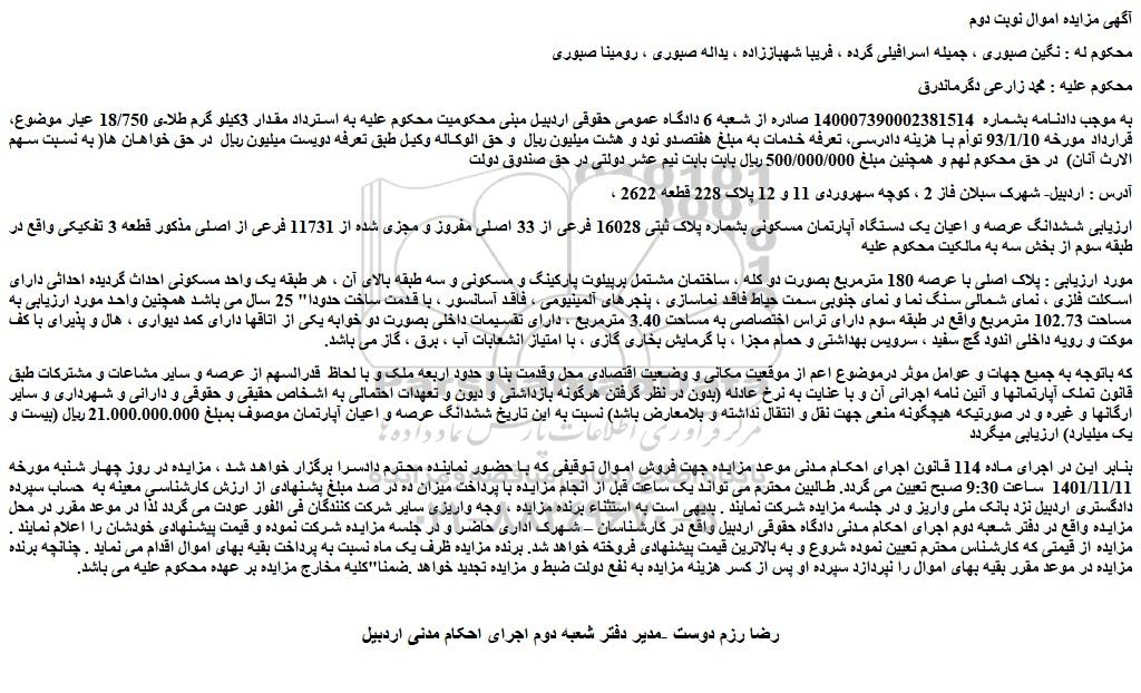 ،به موجب دادنامه بشماره 140007390002381514 صادره از شعبه 6 دادگاه عمومی حقوقی اردبیل مبنی محکومیت محکوم علیه به استرداد مقدار 3کیلو گرم طلای 18/750 عیار موضوع قرارداد مورخه 93/1/10 توأم با هزینه دادرسی، تعرفه خدمات به مبلغ هفتصدو نود و هشت میلیون ریال و حق الوکاله وکیل طبق تعرفه دویست میلیون ریال در حق خواهان ها( به نسبت سهم الارث آنان) در حق محکوم لهم و همچنین مبلغ 500/000/000 ریال بابت بابت نیم عشر دولتی در حق صندوق دولت