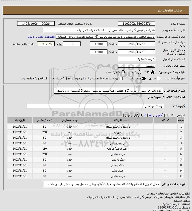 نام دستگاه خریدار:شرکت پالایش گاز شهید هاشمی نژاد استان خراسان رضوی