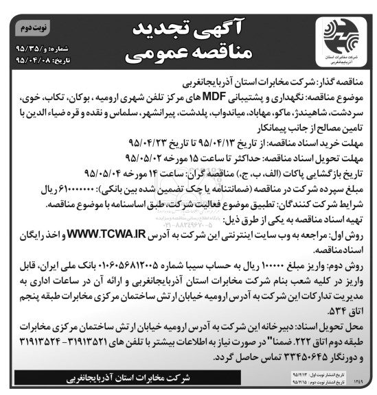 مناقصه گزار : شركت مخابرات استان آذربایجان غربی