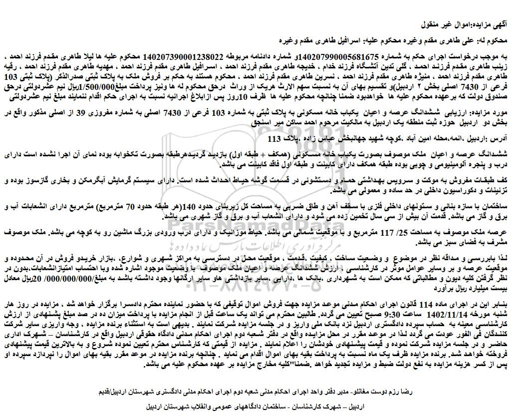به موجب درخواست اجرای حکم به شماره 140207990005681675و شماره دادنامه مربوطه 140207390001238022 محکوم علیه ها لیلا طاهری مقدم فرزند احمد ، زینب طاهری مقدم فرزند احمد ، گلی تدین آتشگاه فرزند خدام ، خدیجه طاهری مقدم فرزند احمد ، اسرافیل طاهری مقدم فرزند احمد ، مهدیه طاهری مقدم فرزند احمد ، رقیه طاهری مقدم فرزند احمد ، منیژه طاهری مقدم فرزند احمد ، نسرین طاهری مقدم فرزند احمد ، محکوم هستند به حکم بر فروش ملک به پلاک ثبتی صدرالذکر (پلاک ثبتی 103 فرعی از 7430 اصلی بخش ۲ اردبیل)و تقسیم بهای آن به نسبت سهم الارث هریک از وراث  درحق محکوم له ها ونیز پرداخت مبلغ1/500/000ریال نیم عشردولتی درحق صندوق دولت که برعهده محکوم علیه ها  خواهدبود ضمنا چنانچه محکوم علیه ها  ظرف 10روز پس ازابلاغ اجرائیه نسبت به اجرای حکم اقدام ننمایند مبلغ نیم عشردولتی