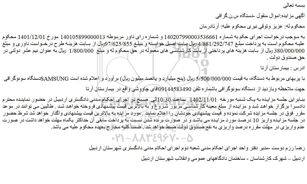 اگهی مزایده:اموال منقول -دستگاه س.ن.گرافی