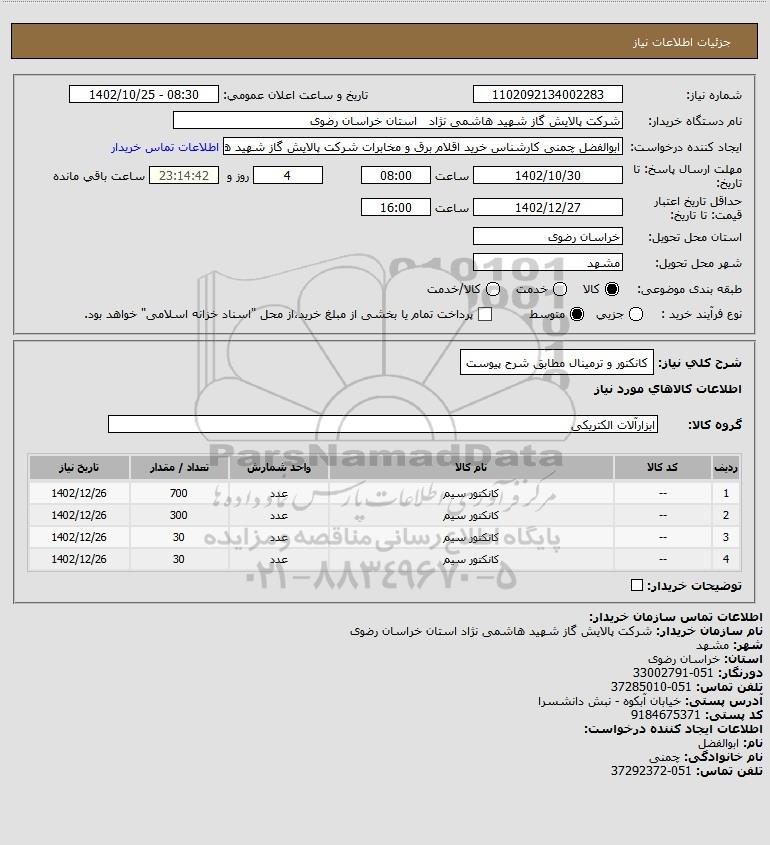 شرح کلی نیاز: کانکتور و ترمینال مطابق شرح پیوست