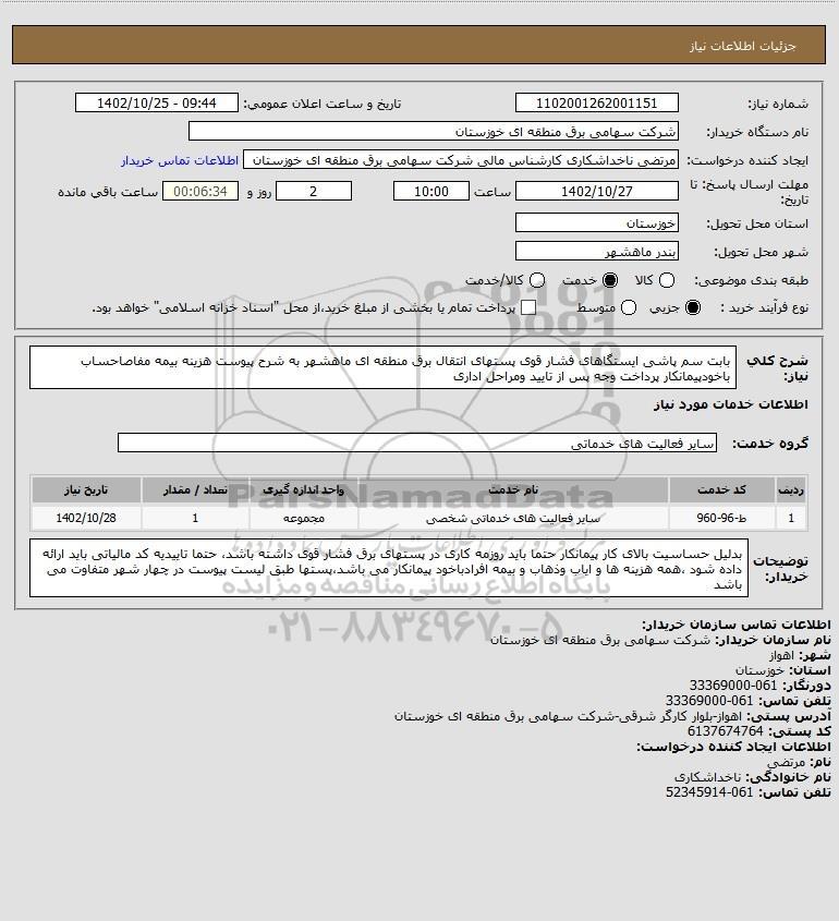 شرح کلی نیاز: بابت سم پاشی ایستگاهای فشار قوی پستهای انتقال برق منطقه ای ماهشهر به شرح پیوست هزینه بیمه مفاصاحساب باخودپیمانکار پرداخت وجه پس از تایید ومراحل اداری