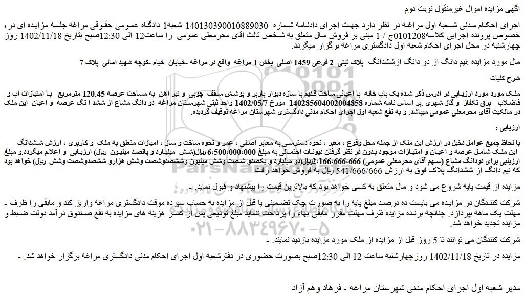 - مزایده در تاریخ 1402/11/18 روزچهارشنبه ساعت 12 الی 12:30صبح بصورت حضوری در دفترشعبه اول اجرای احکام مدنی دادگستری مراغه برگزار خواهد شد.
