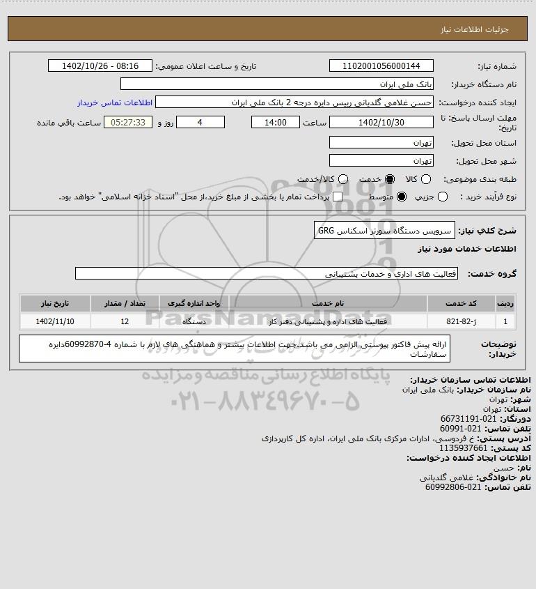شرح کلی نیاز: سرویس دستگاه سورتر اسکناس GRG