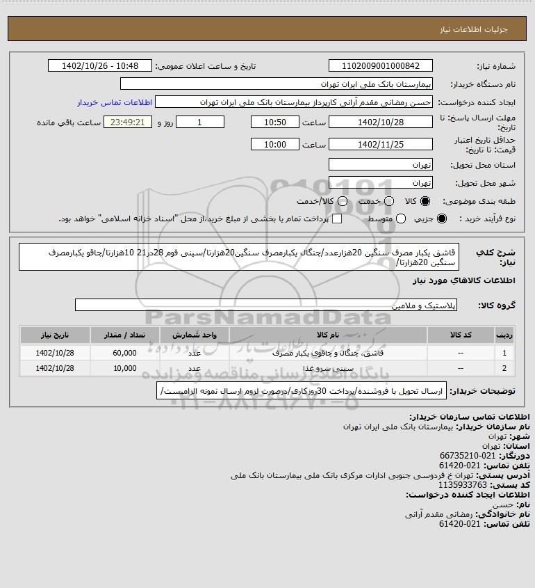 | 1 | -- | قاشق، چنگال و چاقوی یکبار مصرف | عدد | 60,000 | 1402/10/28 |
