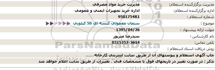 استعلام بها و موضوع استعلام استعلام سیمان معمولی کیسه ای 50کیلوئی-95.4.19 به اطلاع کلیه شرکتها و افراد متخصص واجد شرایط میرساند، آگهی گذار در نظر دارد از طریق استعلام بها، نسبت به انتخاب و دریافت پیشنهادات اقدام نماید. این استعلام با کد آگهی ثبت شده در سامانه خبرگزاری پارس نماد : 691856 منتشر شده است. مشخصات استعلام : تاریخ شروع استعلام: 1395/04/19 آخرین مهلت ارسال پیشنهاد قیمت : 1395/04/26 و محل اجرای پروژه : استان اصفهان میباشد. استعلام قیمت مورد درخواست : استعلام سیمان معمولی کیسه ای 50کیلوئی-95.4.19 با دستهبندیهای تخصصی و گروه های مرتبط : مصالح و تجهیزات صنعت سیمان, مصالح ساختمانی, استعلام اطلاع رسانی میگردد.
