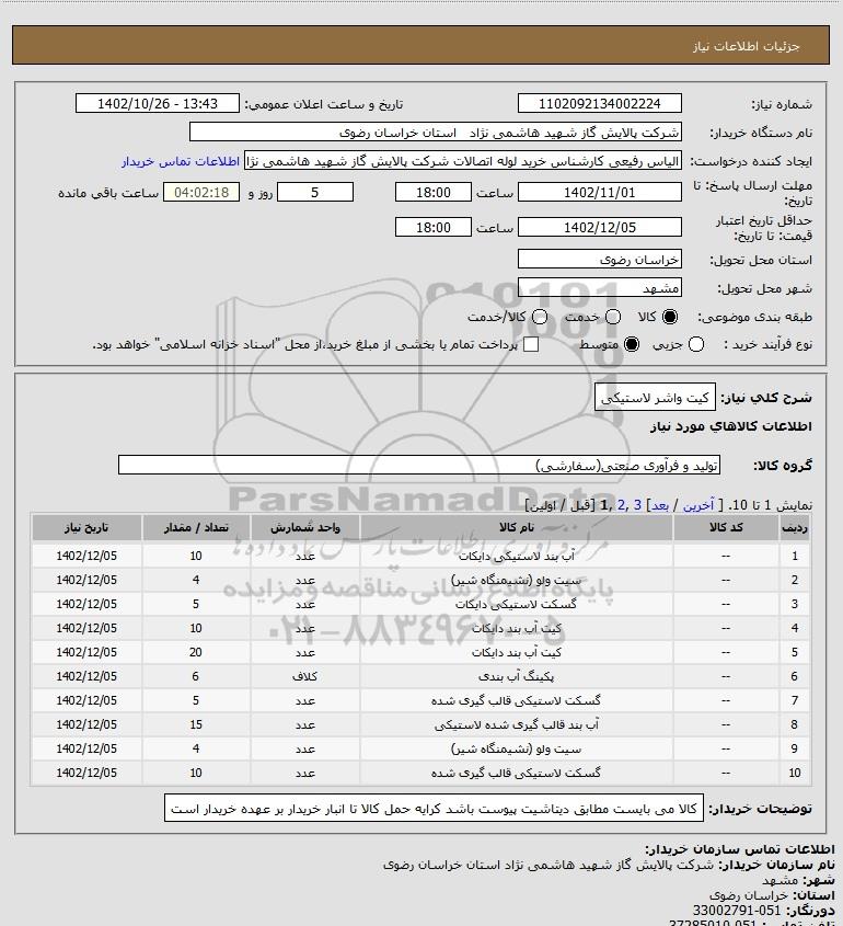 نام دستگاه خریدار:شرکت پالایش گاز شهید هاشمی نژاد استان خراسان رضوی
