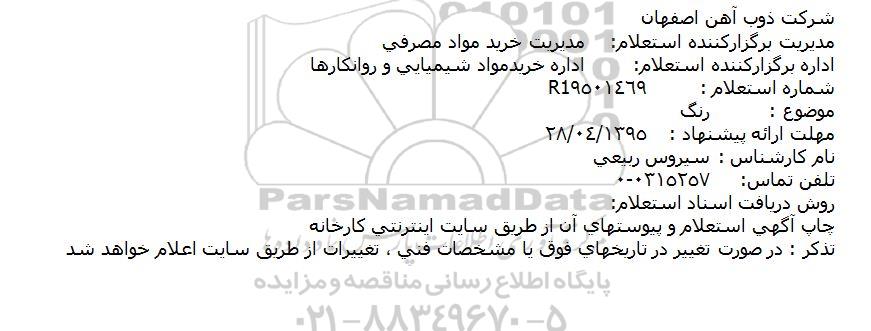 استعلام بها و موضوع استعلام استعلام رنگ به اطلاع کلیه شرکتها و افراد متخصص واجد شرایط میرساند، آگهی گذار در نظر دارد از طریق استعلام بها، نسبت به انتخاب و دریافت پیشنهادات اقدام نماید. این استعلام با کد آگهی ثبت شده در سامانه خبرگزاری پارس نماد : 692540 منتشر شده است. مشخصات استعلام : تاریخ شروع استعلام: 1395/04/20 آخرین مهلت ارسال پیشنهاد قیمت : 1395/04/28 و محل اجرای پروژه : استان اصفهان میباشد. استعلام قیمت مورد درخواست : استعلام رنگ با دستهبندیهای تخصصی و گروه های مرتبط : صنایع رنگ،رزین و چسب, استعلام اطلاع رسانی میگردد.