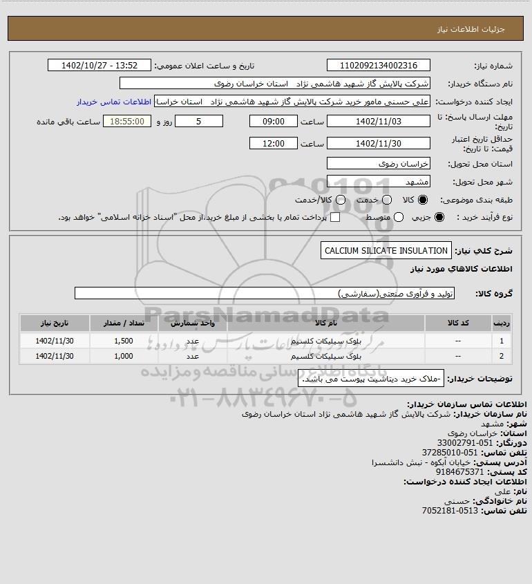 | 1 | -- | بلوک سیلیکات کلسیم | عدد | 1,500 | 1402/11/30 |