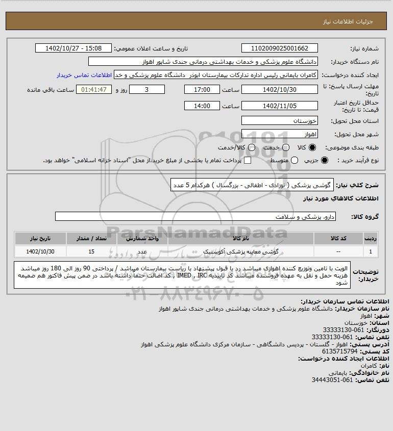 | 1 | -- | گوشی معاینه پزشکی آکوستیک | عدد | 15 | 1402/10/30 |
