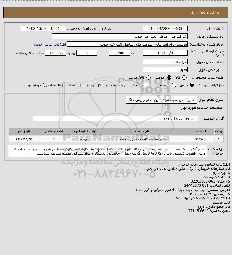 شرح کلی نیاز: تعمیر کامل سیستم هیدرولیک لودر یونی ماگ