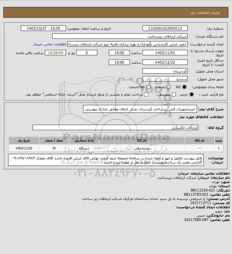 شرح کلی نیاز: خریدتجهیزات فنی زیرساخت کردستان بخش انتقال مطابق مدارک پیوستی
