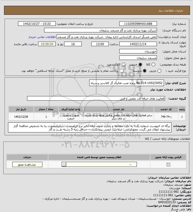 توضیحات خریدار:برگه ی «پیوست شماره یک» به دقت مطالعه و رعایت شود. ارائه آنالیز نرخ الزامیست. درغیراینصورت بنا به تشخیص مناقصه گزار پیشنهاد ابطال می گردد. مجوزالزامی: صلاحیت ایمنی پیمانکاری ---حداقل رتبه 5 رشته نفــت و گاز